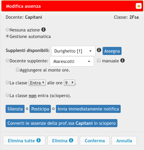 Il programma cerca automaticamente i supplenti disponibili dal proprio database e li propone all'utente, che può approvarli semplicemente cliccando su